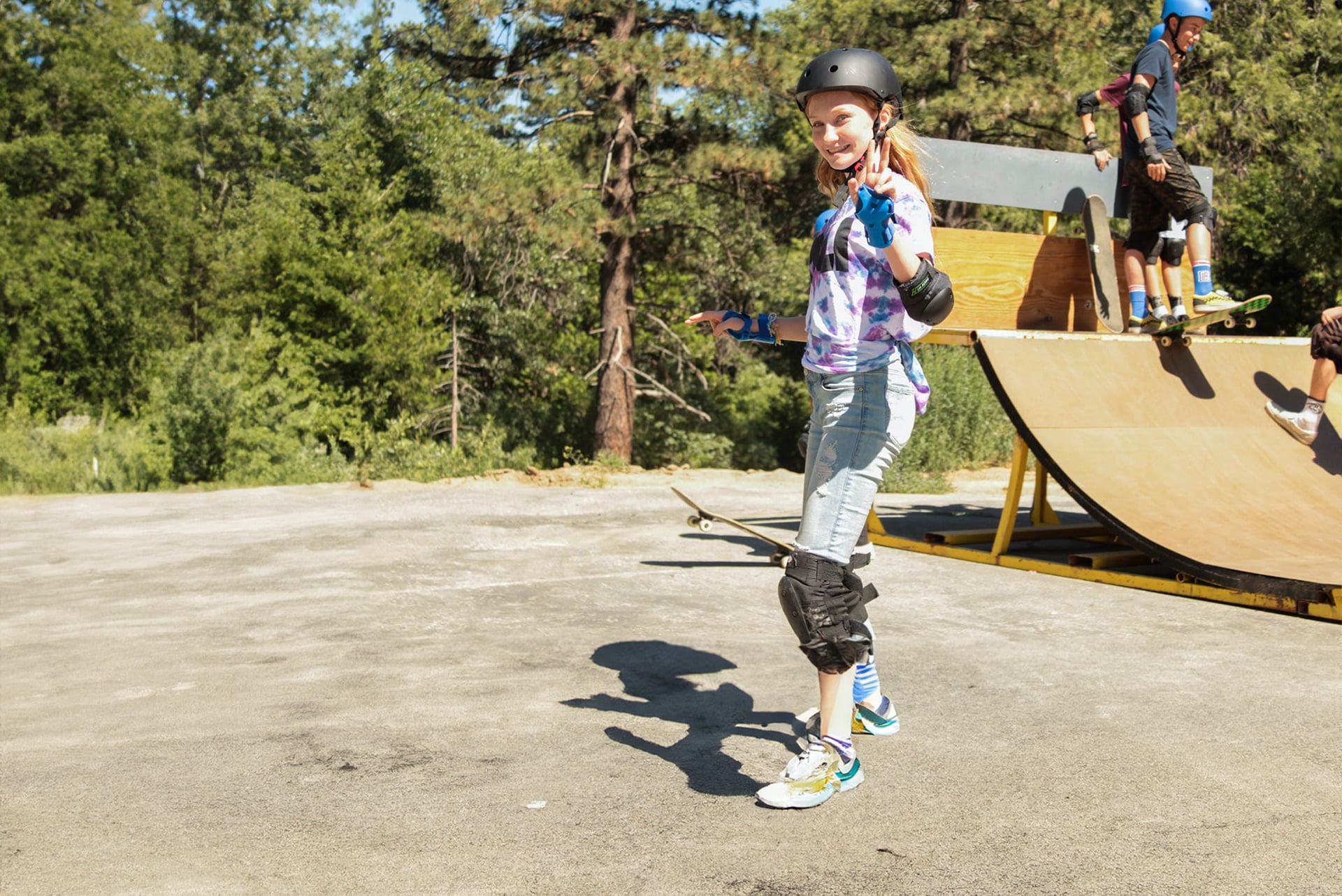 Everyone can try skateboarding! Bring your own skateboard or use one of the ones provided at our skate park, which features quarter and half-pipes, rails, and other assorted ramps and jumps. Our instructors are always there to lend a helping hand to first-time skaters.